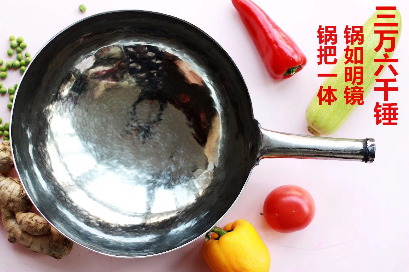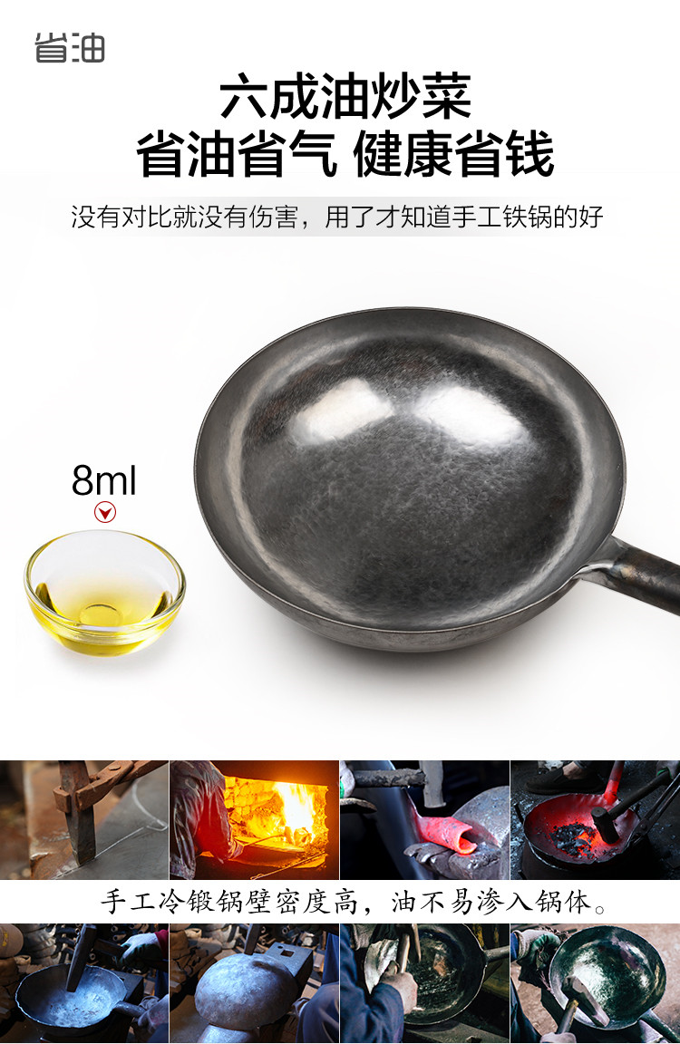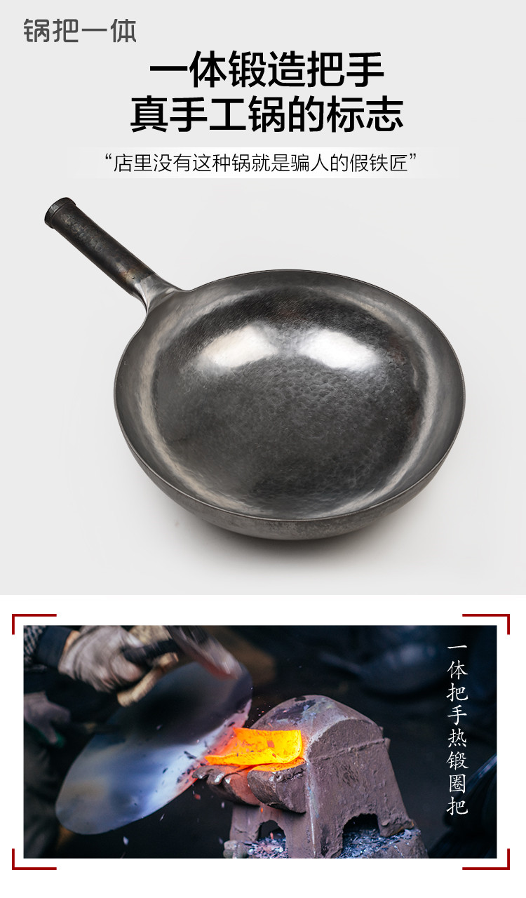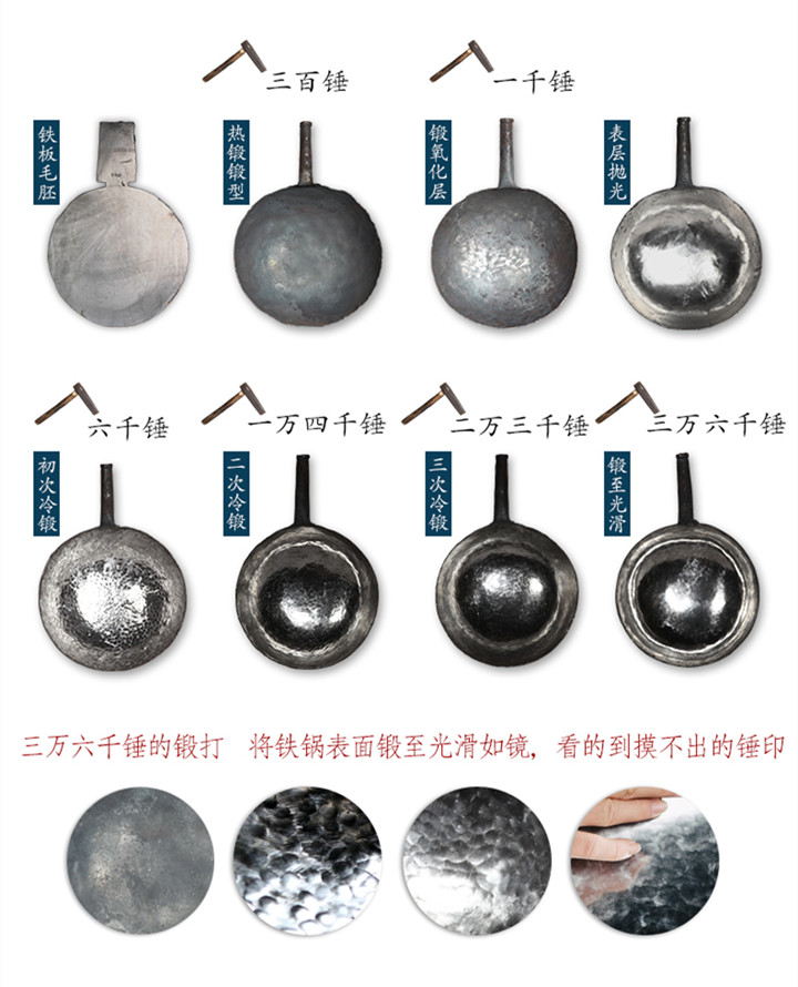 三万六千锤,纯手工敲打,锅如明镜,锅把一体,无涂层不粘锅,密度高不吸油,